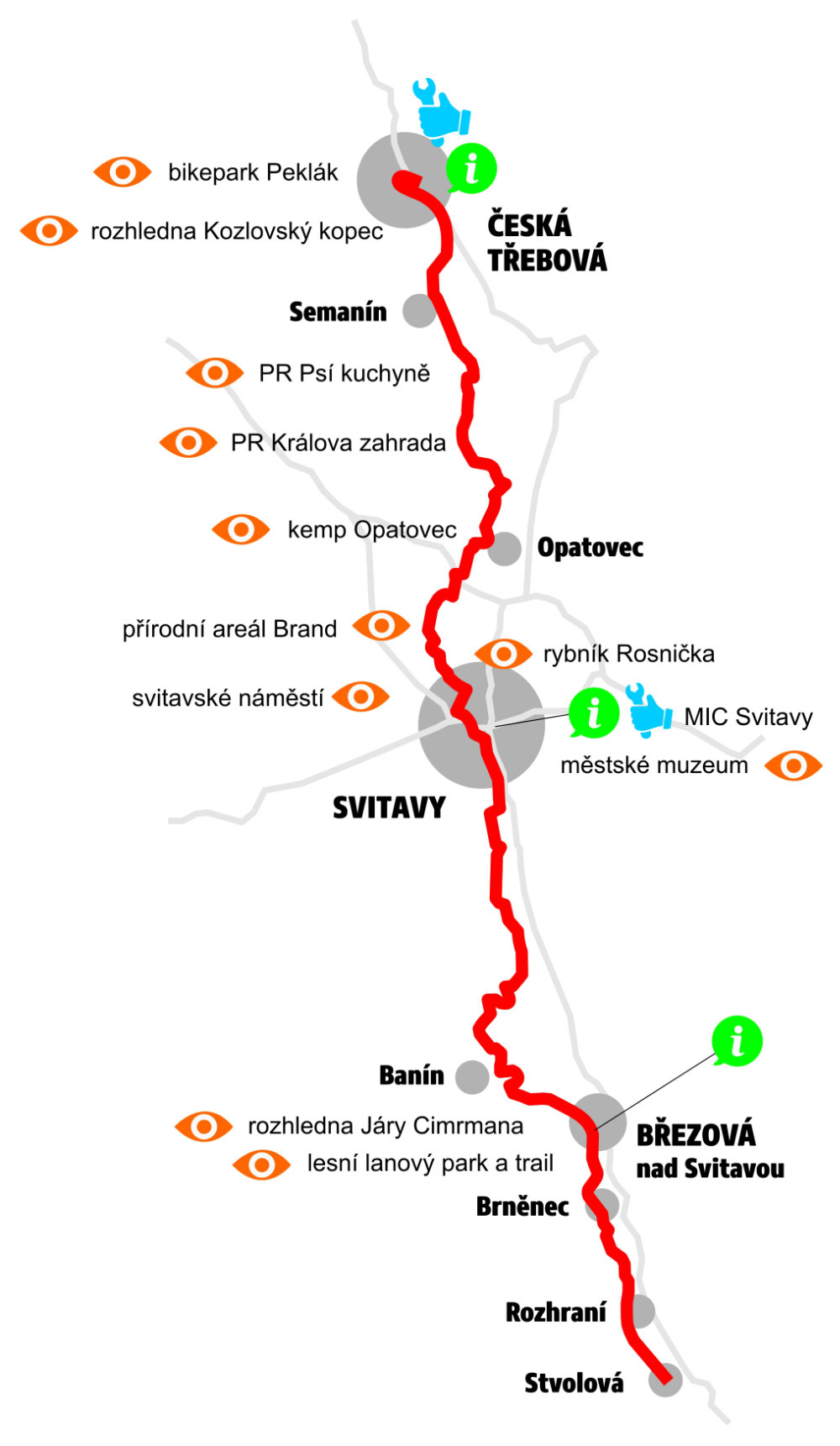 Úsek začíná v centru České Třebové u dopravního terminálu na náměstí Jana Pernera. Nejkratším směrem opouští centrum a vede přes obce Semanín, Opatov, Opatovec, Svitavy, Hradec nad Svitavou, Březová nad Svitavou, Brněnec a Rozhraní. Úsek momentálně končí ve Stvolové, v budoucnu se však můžeme těšit na prodloužení do Skrchova či Letovic a později i do Blanska.